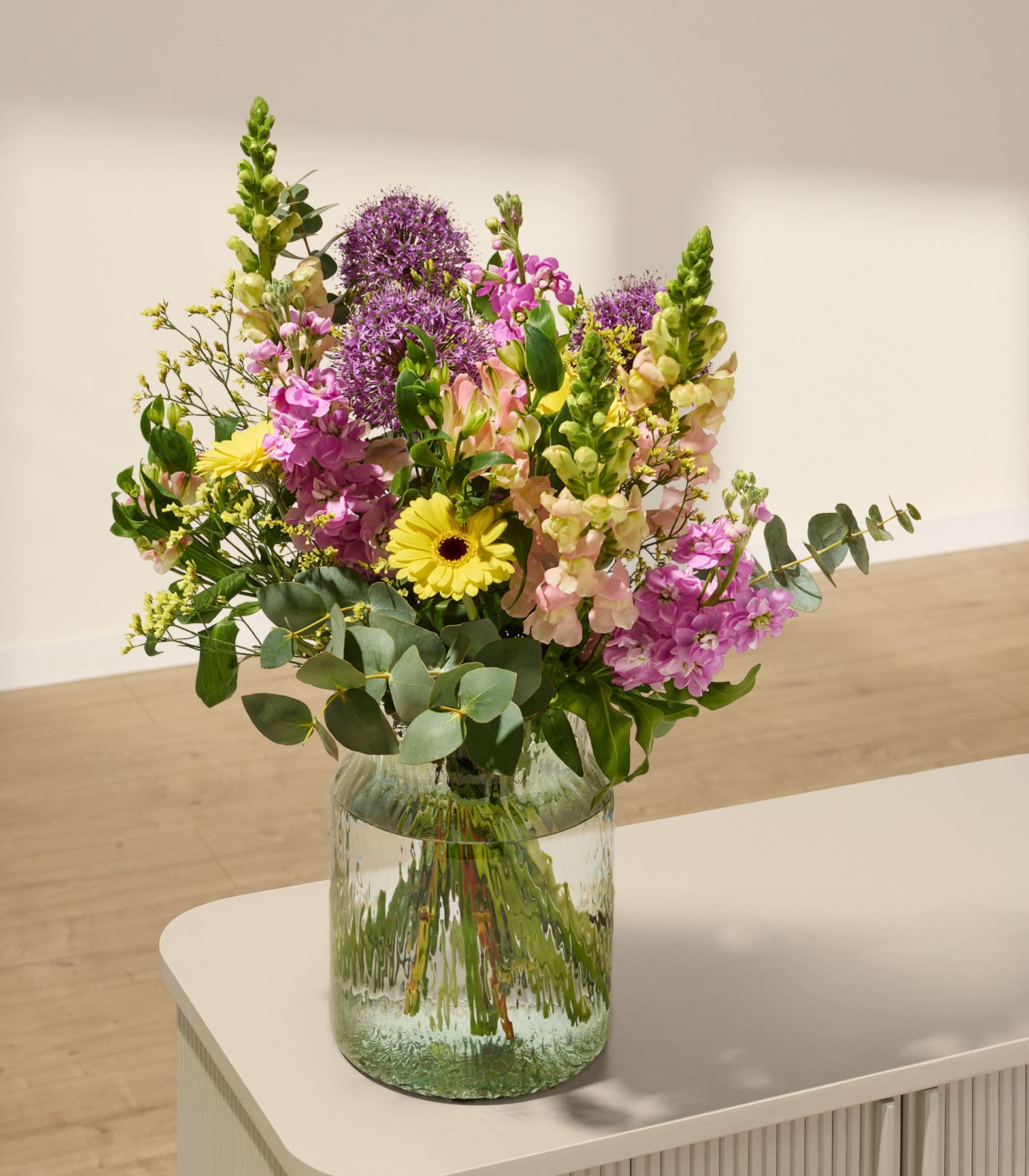 Sanft wie ein Sommermorgen präsentiert sich unser Wiesenblumenstrauß Pastelmix in zarten Rosé-, Lila- und Gelbtönen. Allium, Alstromerien, Löwenmaul, Levkojen und Gerbera werden von feinem Limonium und Eukalyptus begleitet. Die pastelligen Farben wirken beruhigend und gleichzeitig erfrischend – ideal, um ein liebevolles Geschenk zu überreichen. Dieser Strauß strahlt Leichtigkeit und Eleganz aus und passt perfekt zu entspannten Sommertagen. Die harmonische Kombination aus Blüten und Grün sorgt für ein ausgewogenes Gesamtbild. Ein floraler Gruß, der sanft berührt und lange Freude schenkt.